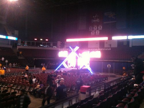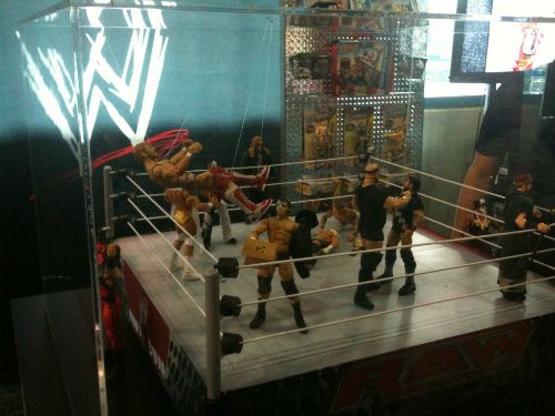 LAST NIGHT THE WWE WAS BACK IN BAKERSFIELD AS PART OF THEIR SMACKDOWN WORLD TOUR. NOW I'M MORE OF A RAW GUY MYSELF BUT IT WAS STILL COOL TO GO TO A SHOW. AND IT WAS QUITE THE SHOW. IT WASN'T A TV SHOW BUT THE SMALL SET UP THEY HAD WAS IMPRESSIVE AND REMINDED ME OF THE OLD DAYS WHERE THEY DIDN'T HAVE HAVE THE BIG TITANTRON (SCREEN) OR ALL THE BIG SETS. ALL THEY HAD WAS A CURTAIN AND THE LOGO ABOVE IT. ALSO THEY HAD SMALL SET UP OF THE ACTION FIGURES IN LOBBY. TO SEE THAT AND THE WAY IT WAS SET UP REALLY BROUGH ME BACK TO MY CHILDHOOD. THOSE WERE MY FAVORITE TOYS GROWING UP. I'D SIT THERE AND PLAY WITH THEM FOR HOURS. AND I ALWAYS WANTED A SET UP LIKE THIS AS I GOT OLDER. BUT I WAS REAL CREATIVE WITH MINE AND ALWAYS BUT ON A SHOW WHEN I PLAYED WITH THEM. I HAD RINGS ON RINGS, CAGES, TABLES, ETC. AND I WENT ALL OUT WITH COLORING WASHABLE RED MARK ON THEM FOR BLOOD. TO REALLY HITTING THE CHAIRS ON THEIR HEADS. MANY BROKE BUT THERE WAS NOTHING MOM'S GLUE GUN COULDN'T FIX HAHA. AWESOME TIMES!! LAST NIGHT'S SHOW FEATURED MY FAVORITE RANDY ORTON (LIKED HIM SINCE HE STARTED), THE BIG SHOW, SHEAMUS, DANIEL BRYAN, ALBERTO DEL RIO, CODY RHODES, WADE BARRETT, ALICIA FOX, AND OTHERS. THE SUPERSTARS MADE THE SHOW AWESOME BY DOING THE WHOLE TALKING AND THEN WRESTLING AND MAKING IT A SHOW. AND A CAGE MATCH AT THE END!! HELL YEAH!!! AND ANOTHER THING THAT WAS COOL AFTER THE LAST MATCH RANDY ORTON WENT AROUND THE WHOLE RING SHAKING THE FANS HANDS AND SIGING SOME AUTOGRAPHS. ALWAYS COOL TO SEE THE WRESTLERS INTERACT WITH FANS!!